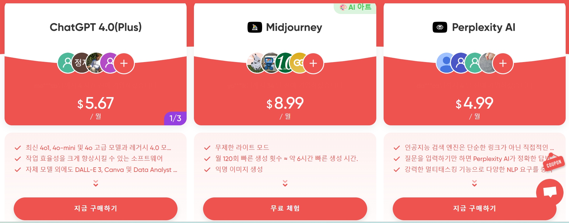 •  ChatGPT 4.0, Midjourney, Perplexity 등의 AI 서비스를 저렴하게 쓰고 싶은 사람