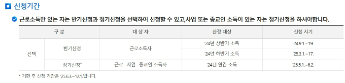 다만, 반기신청은 근로소득만 있는 근로자만 신청할 수 있으며, 만약 사업이나 기타 소득이 있다면 5월 정기신청만 가능하거나 정산이 늦춰질 수 있습니다. 또한 상·하반기 둘 중 한 번만 신청하면 되므로, 본인에게 더 유리한 시기를 잘 따져보고 선택하시기를 권합니다.
