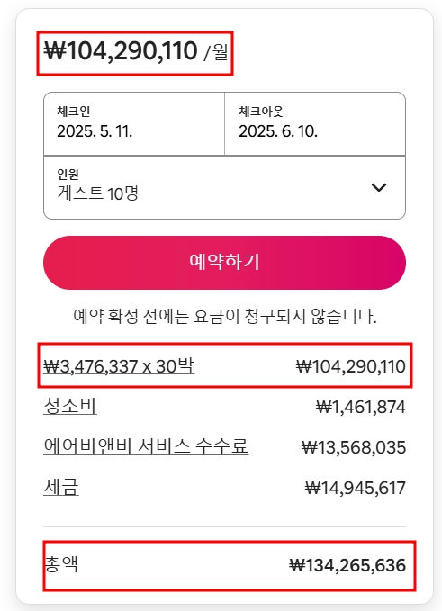 한 달 단위로 렌트가 가능한 집이었고, 최대 10명까지 가능하고, 순수 렌트비만 1억 4백만 원대. 청소비, 수수료 세금을 포함하니 한 달에 무려 1억 3천만 원대의 렌트비를 지불해야 거주가 가능한 곳입니다.