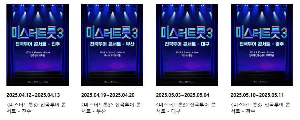 미스터트롯 3 전국투어 콘서트는 전국투어를 기획하고 최대한 많은 분들을 만나려고 준비한 거 같아요. 꼭 그 지역이 아니더라도 제일 가까운 지역 콘서트 티켓을 선점하셔서 즐거운 시간 되시기를 바라요.