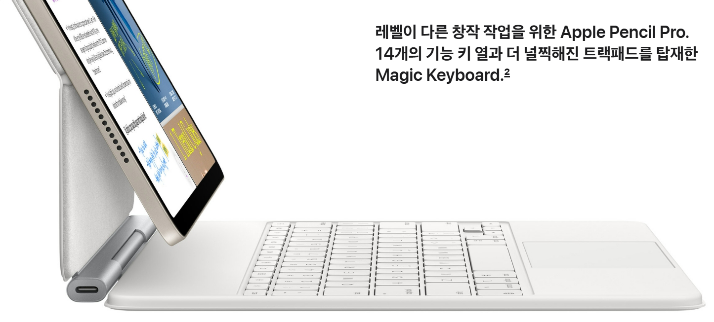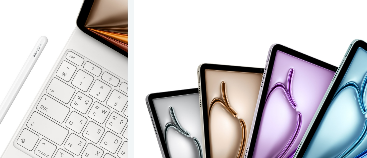 신형 아이패드 에어 (iPad Air)는 애플 펜슬 프로(Apple Pencil Pro)와 새로운 매직키보드(Magic Keyboard)를 완벽히 지원한다고 해요. 요즘 콘텐츠 작업을 주업을 하시는 분들이 늘어나시고 계시던데 매우 편리하게 사용하실 수 있을 거 같다는 생각이 들어요.