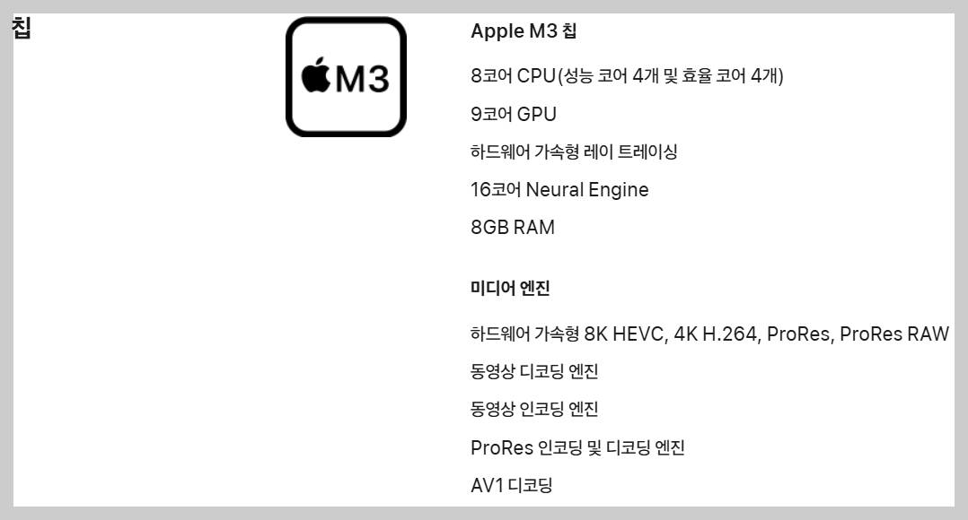 바로 전작모델과 비교했을 때 가장 눈에 띄게 달라진 점이 바로 M3 칩입니다.