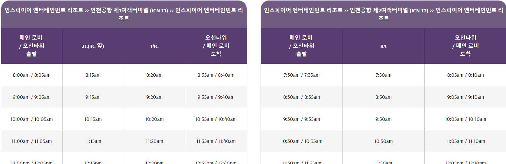 홈페이지에 들어가시면 위 이미지처럼 코스별 시간대 확인 가능하시니 참고하세요.