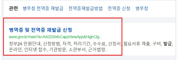 검색창에 '전역증 재발급'을 치시면 아래 화면처럼 나와요. 클릭하면 정부 24로 연결됩니다. 하단에 보이는 '사이트 가기'
