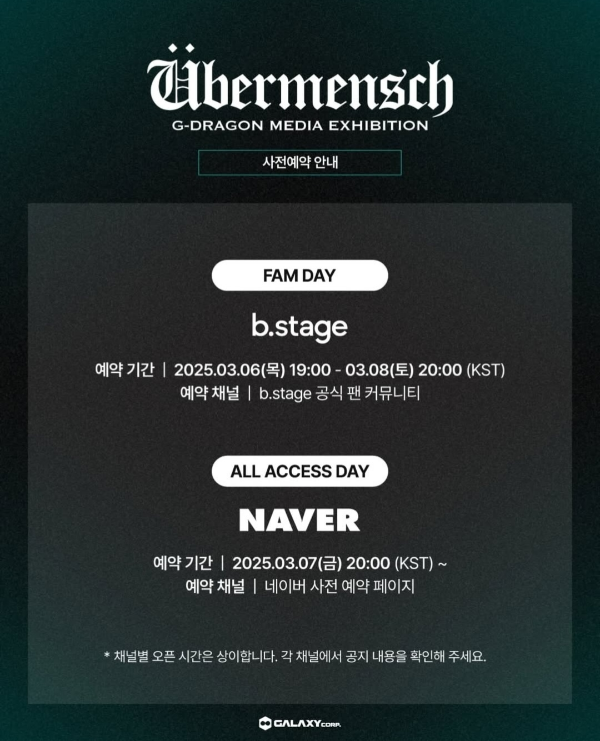 지드래곤 공식 팬클럽이라면 ‘FAM DAY’ 전용 예약기간, 관람일시, 예약채널을 기억하세요. 팬클럽이 아니더라도 걱정하지 마세요. 아래 표에서 일정과 채널에 맞춰 예약하시면 됩니다.