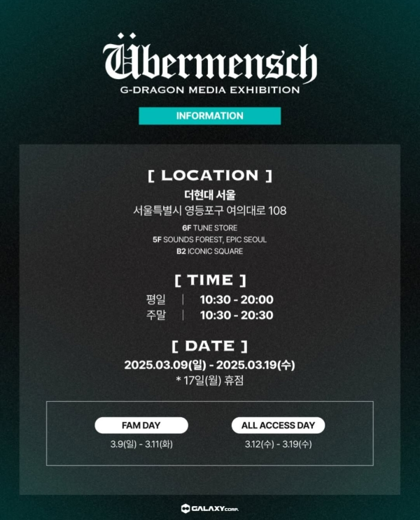 이번 전시회는 ‘G-DRAGON 미디어 전시회: 위버맨 쉬’라는 공식 명칭을 내걸고, 지드래곤이 11년 5개월 만에 발표했다는 세 번째 정규 앨범의 메시지를 바탕으로 펼쳐집니다. 행사를 총괄 기획한 콘텐츠 솔루션 회사 크리에이티브멋(MUT)의 첨단 기술이 곳곳에 적용되어, 가수 지드래곤의 예술적 세계관을 다각도로 체험하게 만드는 점이 가장 큰 특징입니다.