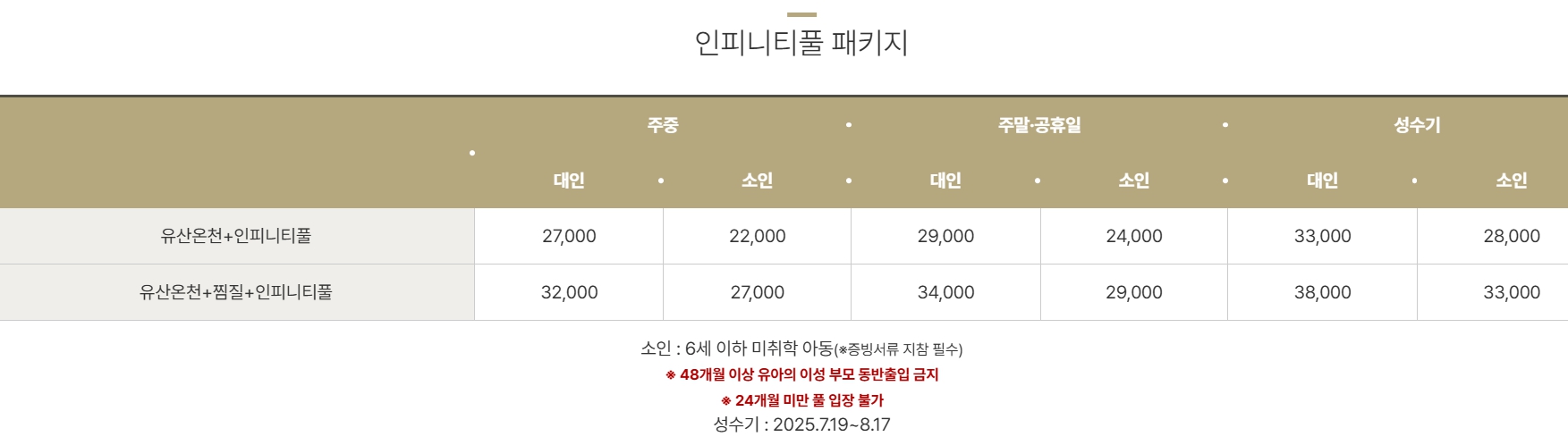 - 복장: 온천과 찜질방 이용 시 편안한 복장을 준비하시고, 수영복은 인피니티풀 이용 시 필요합니다.