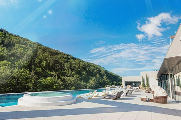 4층에 위치한 온천수 인피니티풀에서는 자연의 마운틴뷰를 감상하며 수영을 즐길 수 있습니다.
