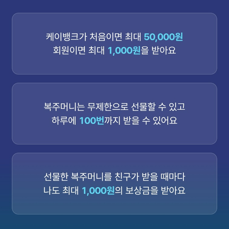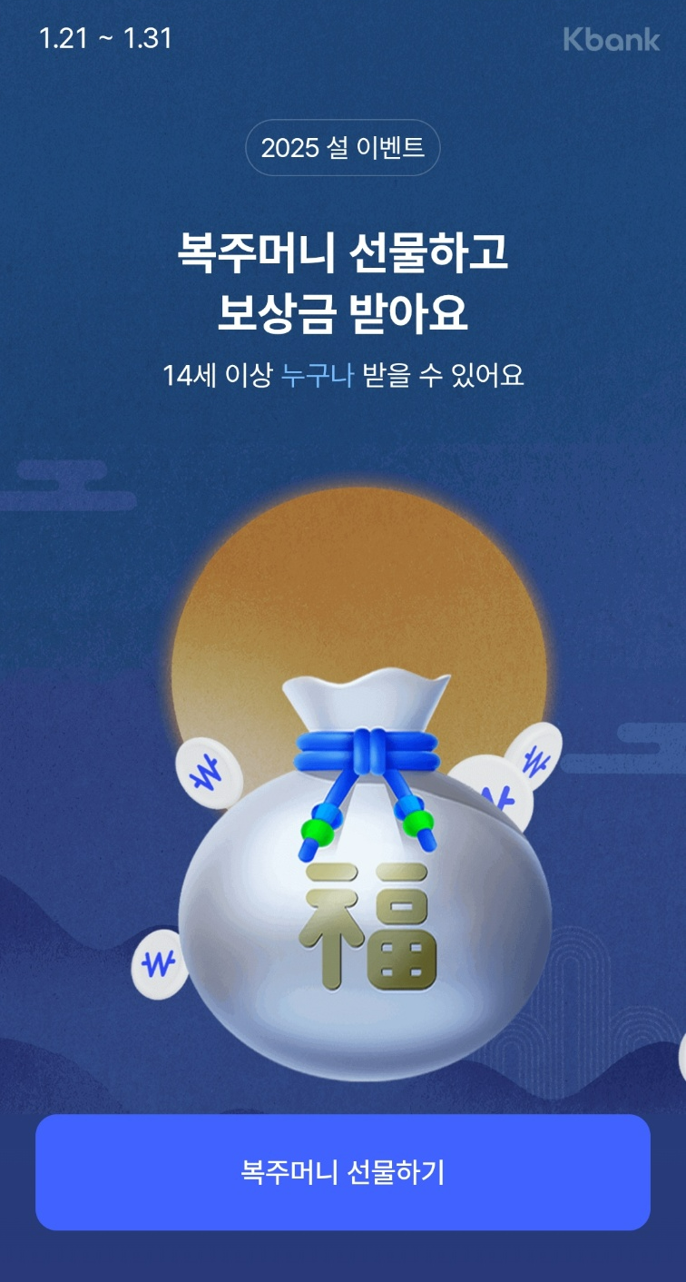 케이뱅크 복주머니 2025 설 이벤트 세뱃돈 받으러 가요! 하루 최대 20만원 쏩니다.