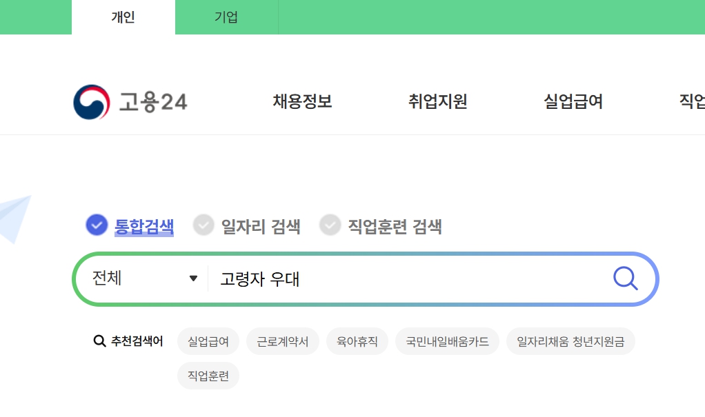 - 워크넷→ ‘고령자 우대’ 입력해 보기