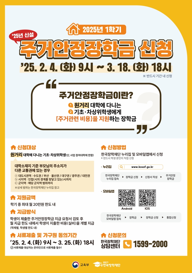 2025년부터 새롭게 시행되는 ‘주거안정장학금’을 통해 안정적인 주거 환경을 마련하고 학생들이 학업에 집중할 수 있도록 지원되는 정부 정책 너무 좋습니다. 많은 학생들에게 적용이 되어 조금 더 확대되기를 바래봅니다.