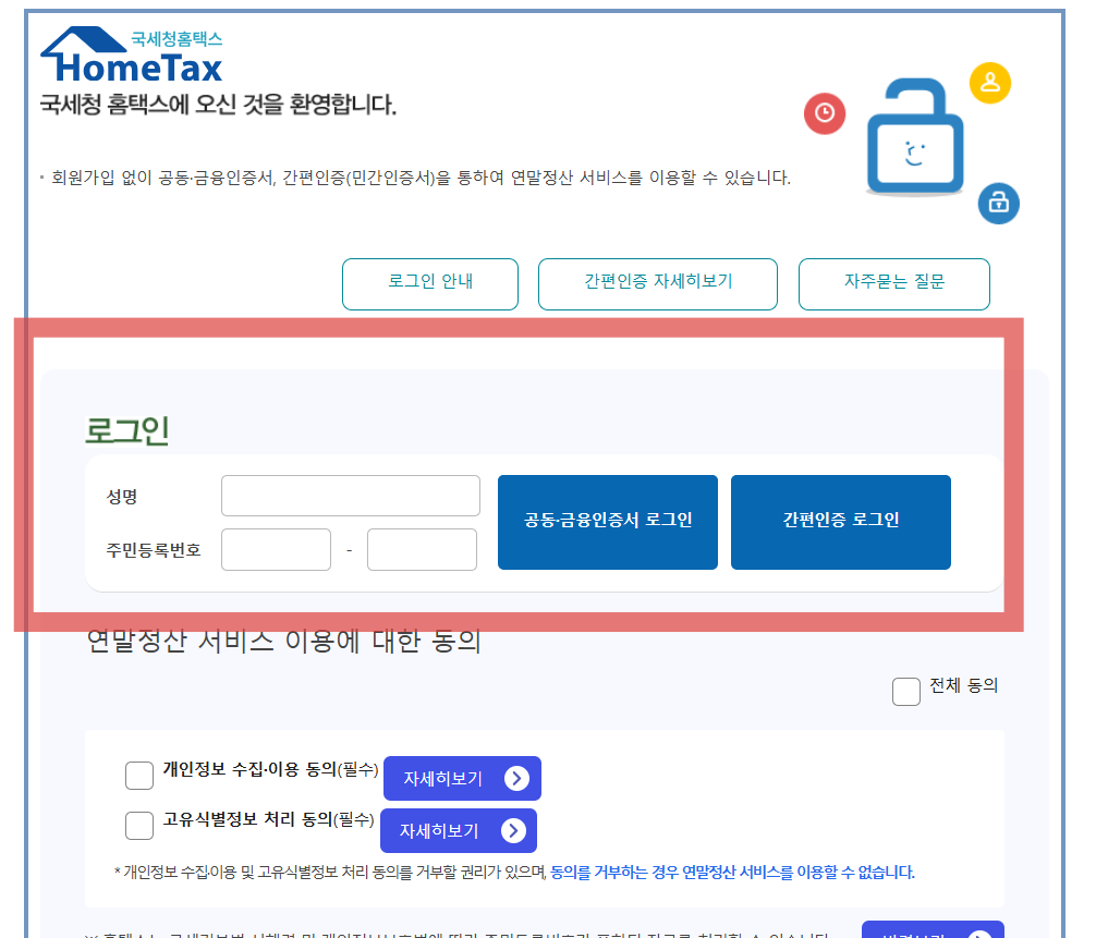 - 홈택스 계정: 회원 가입이 되어 있지 않다면, 먼저 '회원가입'을 하세요.