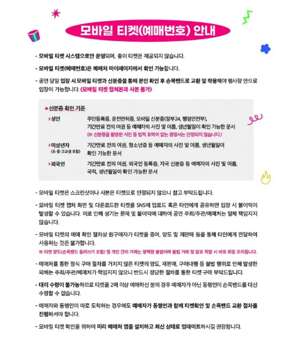 - 티켓 양도 및 개인 간 거래는 불법이며, 적발 시 퇴장 조치됩니다.
