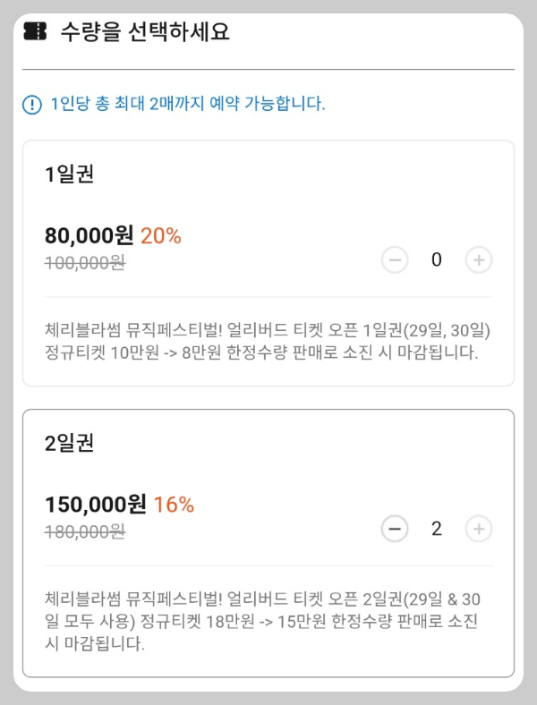1일권, 2일권 중에 선택하시면 되고, 어느 쪽이든 최대 2매까지만 선택 가능.