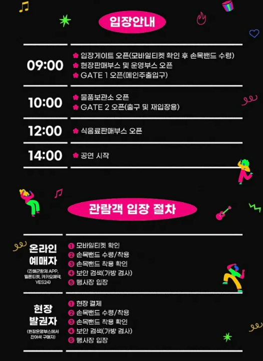 : 예매번호 확인 → 손목밴드 수령 및 착용 → 보안검색(가방 검사) → 공연장 입장