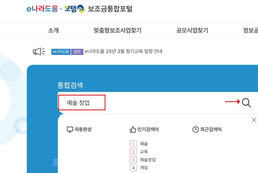 ‘이(e) 나라도움’으로 검색해 공식 사이트로 접속합니다. - 세부 공고 검색