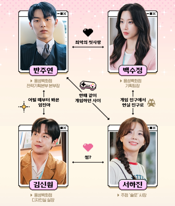 - 백수정(문가영) : 가난한 환경에서 자라 누구보다 치열하게 노력해 왔던 캐릭터로, 솔직하고 강단 있는 성격의 소유자예요. 사내에서는 ‘본부장 킬러’라는 별명까지 얻었을 정도죠. 어렸을 때 온라인 게임에서 만난 ‘흑염룡 오빠’를 잊지 못하고 있는데, 새로 부임한 본부장에게 어딘가 익숙한 느낌을 받아 당혹스러워해요.
